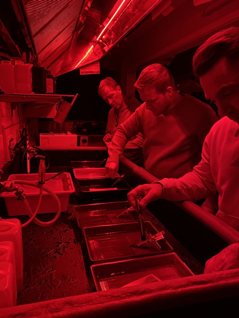 Dann entwickeln wir unsern frisch belichteten Schwarz-Weiß-Film in der passenden Chemie. Gar nicht so leicht, den Film in die Dose zu bekommen, wenn alles in Dunkelheit passieren muss. Aber mit ein paar Tricks klappt auch das nach ein paar Versuchen schnell. Und beim Anmischen der Chemie kommt zum ersten mal „Dunkelkammer-Feeling“ auf und es sind nur noch wenige Augenblicke, bis wir zum ersten Mal fertige Negative aus der Trommel holen. Was für ein tolles Gefühl!